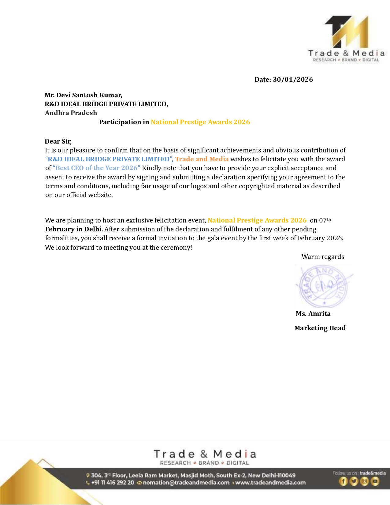 Mr. Devi Santosh Kumar, representing R&D IDEAL BRIDGE PRIVATE LIMITED, Andhra Pradesh, has been officially selected to receive the prestigious “Best CEO of the Year 2026” award at the upcoming National Prestige Awards 2026. The recognition has been conferred based on his significant achievements, strategic leadership, and outstanding contribution to the organization’s growth and innovation.